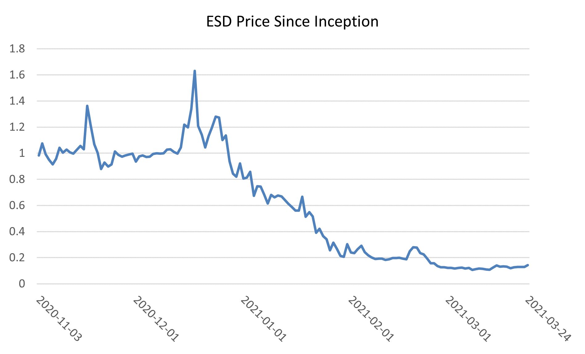 Enticing active traders to put fresh money into the project when the system is under pressure means large rewards need to be offered before they take action. It is very difficult to get the size of these rewards right; if they are too high, they will attract speculators, if they are too low, there might be insufficient buying to defend the peg. This can cause a dynamic where high perceived rewards attract many speculators right after a project launches. After a while, profit taking by these speculators combined with a lack of real users start to prevent structural expansion and dilute the economics. When confidence in future expansion is lost no level of rewards is enough to support the peg and the stablecoin collapses. Unfortunately, this is what happened to ESD about two months after its launch as shown in the graph below.