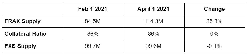 * The Frax’s interface shows that despite net FRAX supply increasing (left hand panel below), the total FXS supply seems to remain stubbornly close to the original issuance amount of 100 million (right hand panel below). This is the case even with the collateral ratio having dropped from the initial 100% to 86% now.