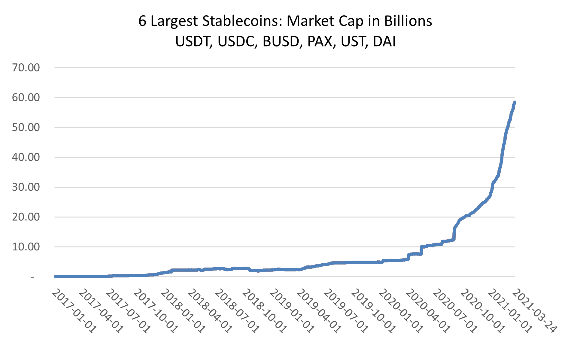 Stablecoins are going through a phase of very rapid expansion; growing from a market cap of USD 4.9 billion at the start of 2020 to about USD 60 billion today.