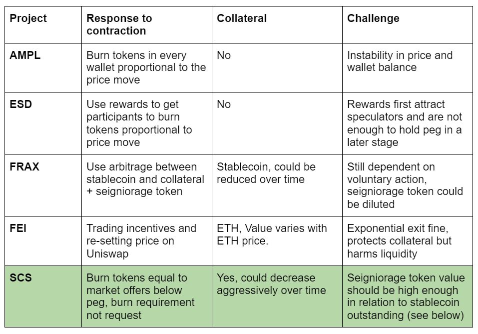 Below we summarize the main features of the projects discussed with the proposed Self-collateralized Stablecoin (SCS) in the bottom row.